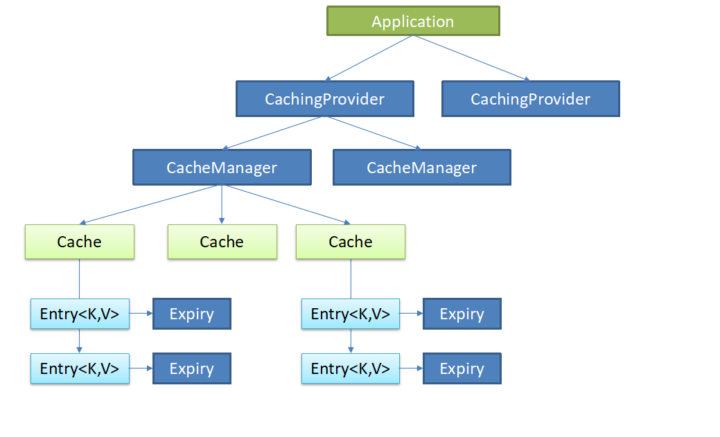 JSR107定义了5个核心接口,分别是CachingProvider, CacheManager, Cache, Entry和Expiry。 CachingProvider定义了创建、配置、获取、管理和控制多个CacheManager。如redis。一个应用可以在运行期访问多个CachingProvider。 CacheManager定义了创建、配置、获取、管理和控制多个唯一命名的Cache,这些Cache存在于CacheManager的上下文中。一个CacheManager仅被一个CachingProvider所拥有。 Cache是一个类似Map的数据结构并临时存储以Key为索引的值。一个Cache仅被一个CacheManager所拥有。 Entry是一个存储在Cache中的key-value对。 Expiry每一个存储在Cache中的条目有一个定义的有效期。一旦超过这个时间,条目为过期的状态。一旦过期,条目将不可访问、更新和删除。缓存有效期可以通过ExpiryPolicy设置。